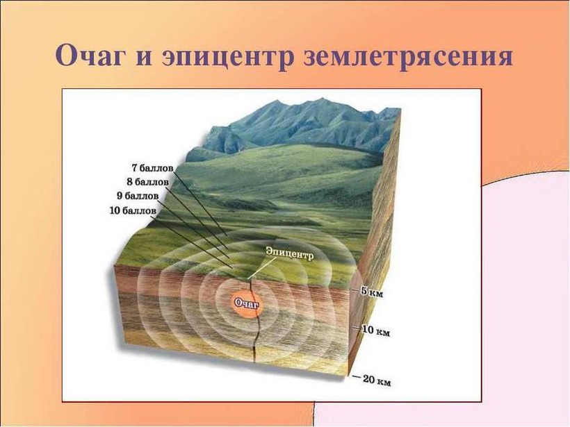 Место где зарождается (образуется) землетрясение - его очаг. Здесь происходит подземный удар, а от этого толчка идет дальше подземные колебания. Место на поверхности земли, которое находится прямо над очагом - это эпицентр землетрясения. На этой территории сила землетрясения самая большая. Но это не означает, что на ближних территория уже подземные толчки уже не будут ощутимы. Сейсмическими волнами движение передается дальше во всех направлениях (радиально). Чем дальше от эпицентра, тем сила подземных вибраций будет меньшей. Эпицентр находится прямо над очагом, потому здесь будет самая большая сила землетрясения.