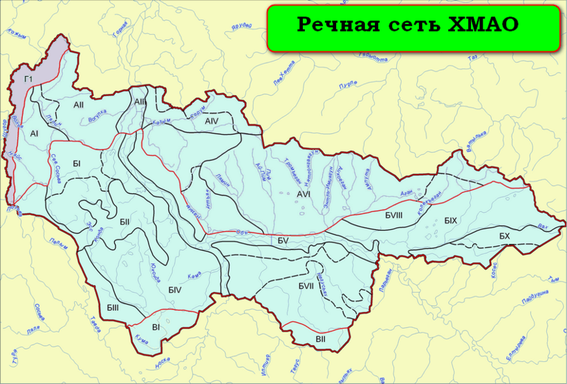 Пресноводная речная сеть ХМАО представлена в количестве 19 600 рек, общим километражем около 100 тыс. км. Она относится к водным округам Баренцева и Карского морей, а при уменьшенном масштабировании — к бассейнам крупных рек округа: