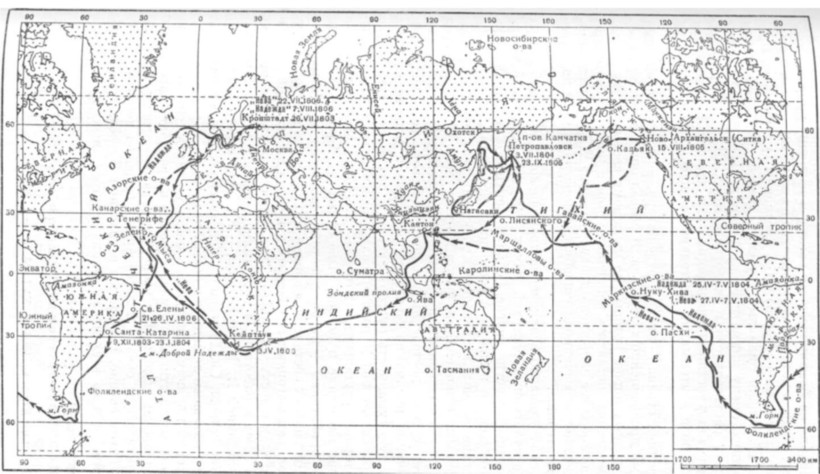 Кругосветное плавание происходило в 1803-1806 годах. Отправившись из Кронштадта, суда посетили Данию, Канарские острова. Обойдя Южную Америку в конце апреля, маршруты кораблей разошлись. Пройдя тысячи миль в водах Тихого океана, «Надежда» подошла к берегам Камчатки и далее направилась в Японию, а «Нева» взяла курс к берегам Аляски. Обратно корабли возвращались также разными маршрутами.