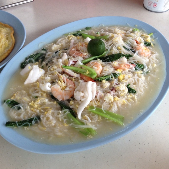 Обжаренная лапша с креветками в Сингапуре сочетает яичную и рисовую лапшу, с кусочками жареного свиного жира, креветками, рыбой и кальмарами. Некоторые производители добавляют полоски свинины, чтобы придать блюду аромат. Это блюдо придумали рабочие лапшичного завода в провинции Хок-кьень.