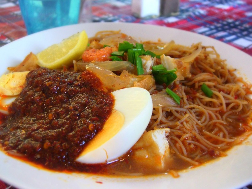 Когда-то его придумал уличный разносчик еды, который носил с собой две корзины: одну – для ингредиентов, другую – для печи и горячей воды. Ми Ребус – это яичная лапша, которую готовят как лапшу с креветками (Hokkien prawn mee), со сладким коричневым соусом карри.