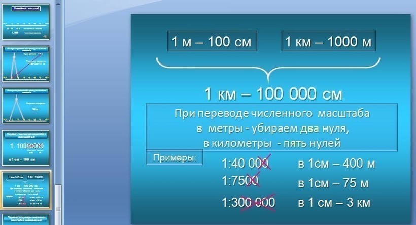 Численное масштабирование – нанесение на карту масштаба цифрами в виде дроби – числителя и знаменателя. Возьмем масштаб изображения географического объекта один к десяти (1:10). Это значит, что 1 метр (сантиметр или километр) реального предмета изображен на бумаге уменьшенным в 10 раз. То есть, 1 метр реки (или дороги) на карте будет протяженностью в 0.1 метра или 10 сантиметров.
