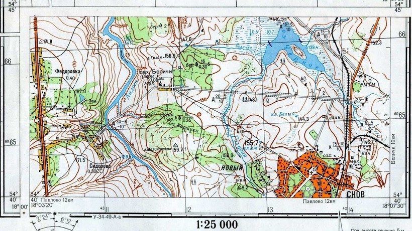 Так же, на карте обязательно присутствуют населённые пункты, обычно на топокарте легко прослеживаются улицы, дома, некоторые даже могут быть подписаны. Чёрным цветом обозначена железная дорога, оранжевым — автомобильные пути.