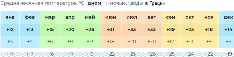 Высокий пляжный сезон приходится на период с середины июня по сентябрь. На курортах устанавливается знойная жара, и даже в тени столбик термометра поднимается до отметки +30–33 °C. Вода в море прогревается до +25–26 °C. Для отдыха в эти месяцы лучше выбирать зеленые острова (Закинтос, Корфу) или курорты в северной части страны (Халкидики, Тасос).