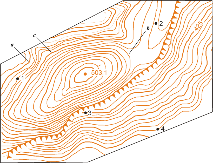 Вершина или же дно изображаются при помощи наименьших сомкнутых объемлемых горизонталей. А отроги гор или лощины – отдельными частями горизонталей, растянутыми по форме языков.