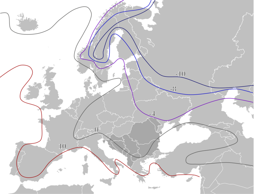 И если сейчас посмотреть на картинку выше, то там изображены изотермы среднегодовой температуры в Европе.