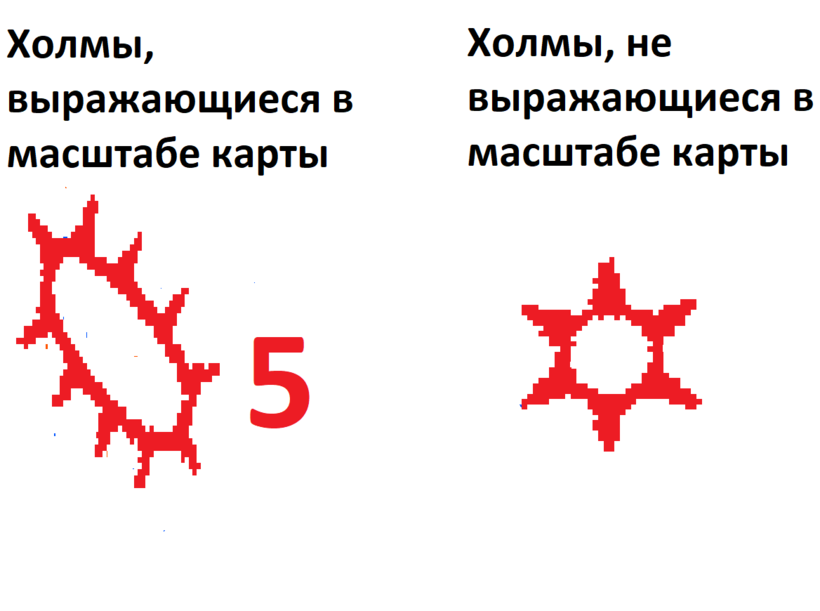 Изображают и впадины, и холмы на карте достаточно похоже — замкнутой линией, которая конфигурацией передаёт приблизительную форму рельефного образования. Отличие в передаче отрицательных и положительных рельефных форм состоит в характере штриховых линий: при изображение впадин — штриховка направлена к центру, при изображение холмов — наоборот.