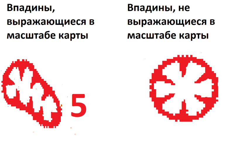 Прежде всего, для изображения на топографической карте холма или впадины используются замкнутые круговые линии. И чем выше/глубже холм или впадина, тем больше изображено этих самых линий. Ну а для того, чтоб понять холм это или впадина, рисуют небольшие штрихи на самих кругах. Если штрихи "внутрь" — то это впадина, а "из" — холм.