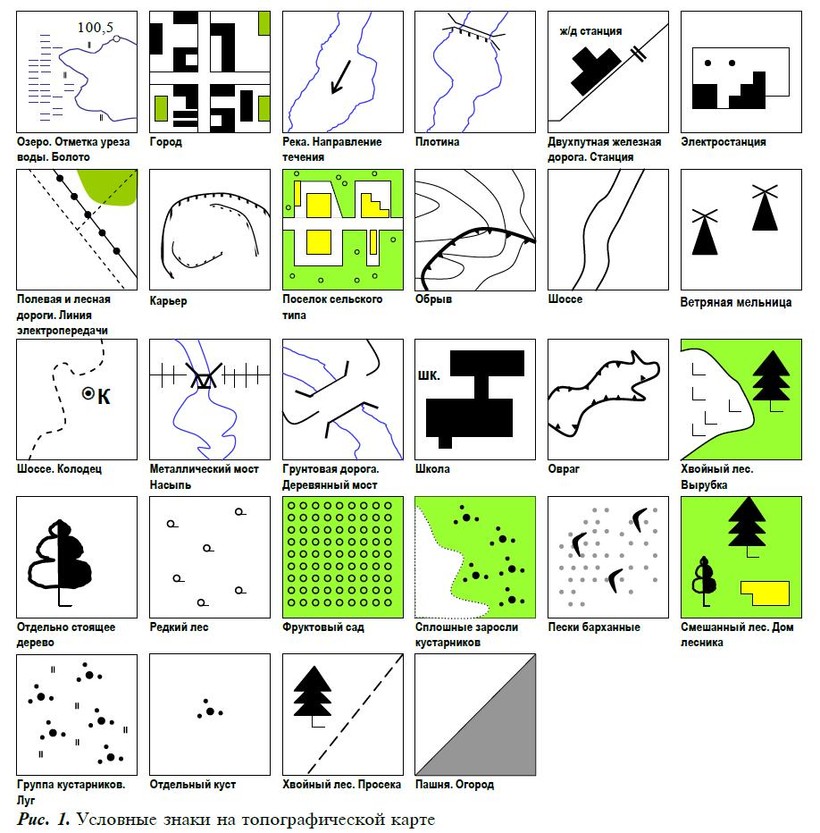 Посредством условных знаков представлены объекты местности на картах. Делятся они на: