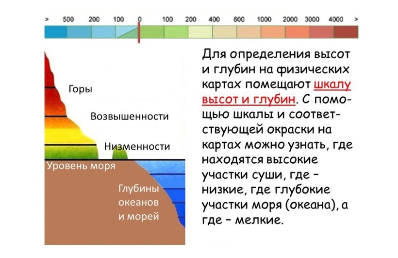 - Изучить карту. На физических картах суша имеет соответствующую окраску, где каждый оттенок соответствует своему значению высоты, указанному на шкале ниже.