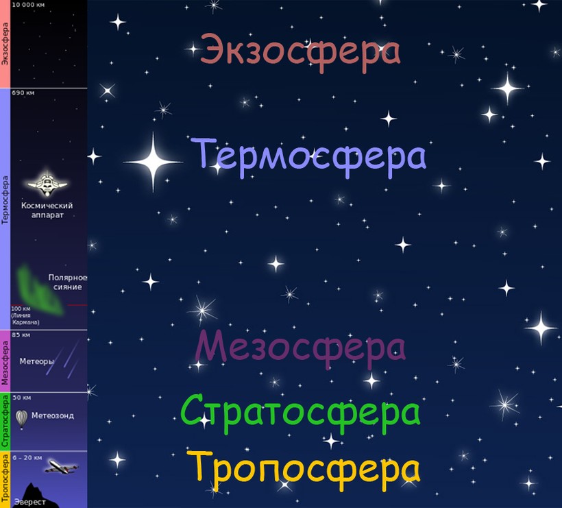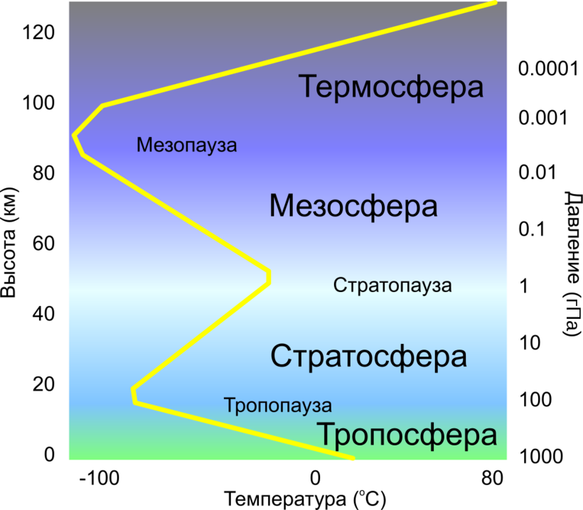 Далее следуют мезопауза, линия Кармана на высоте строго 100 км, и термосфера. Она имеет высоту до 800 км, температура там растет и достигает значения 1500 К.