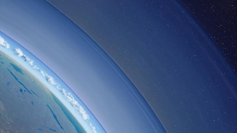 Толщина атмосферы составляет больше 1000 км. 90% атмосферы - это очень разреженная газовая среда, которая не может остановить даже мелкие метеориты, но эта воздушная масса подчинена земному притяжению и вращается вместе с планетой вокруг Солнца.