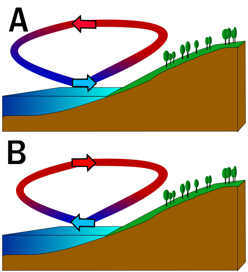 - ночной, противоположное движение: суша, прогретая за день, остывает и воздух двигается в сторону моря;