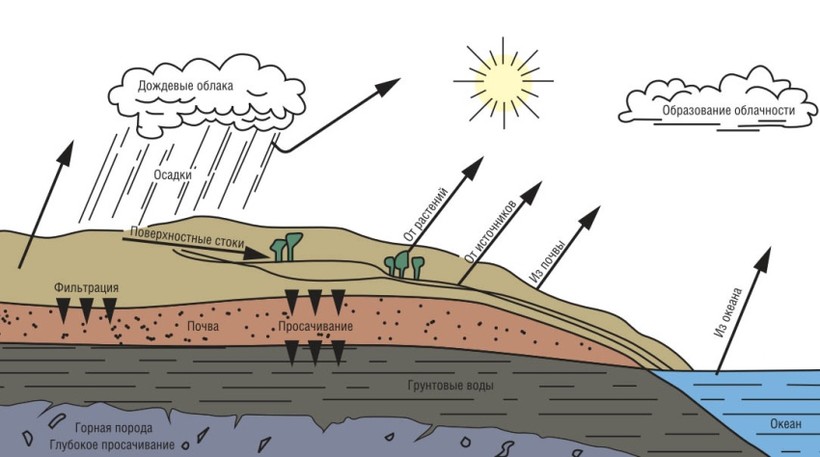 Сначала она испаряется под лучами солнца, затем смешивается с воздухом. Теплые потоки поднимают ее туда, где температура несколько ниже, а поэтому начинается процесс ее конденсации. Ну а от того, какое время года, собственно, и зависит вид выпадающих осадков.
