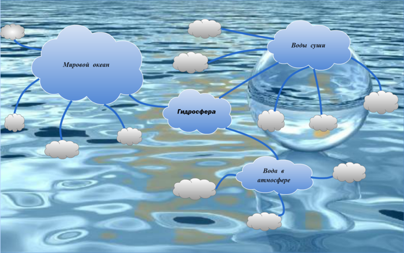 В это понятие входят все водные ресурсы Земли, расположенные как на поверхности, так и в верхнем участке коры. В целом, вода распределена в следующих пропорциях: