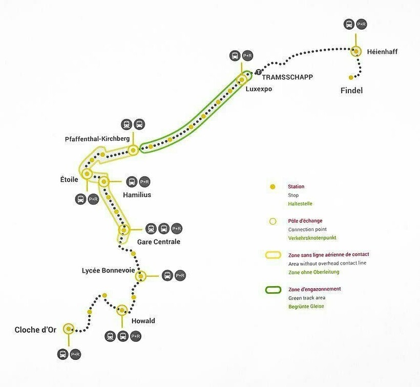 В Люксембурге существует одна трамвайная линия, которая следует от аэропорта до станции Etoile. В 2020 году линию продлили до ж/д вокзала.
