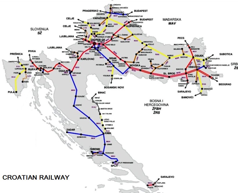 Железнодорожное сообщение лучше всего развито в северной части Хорватии, но доехать на поездах можно и в некоторые города Адриатического побережья — Риеку, Сплит, Задар, Шибеник. Выполнение пассажирских перевозок обеспечивает государственная компания Hrvatske zeljeznice (HZ).