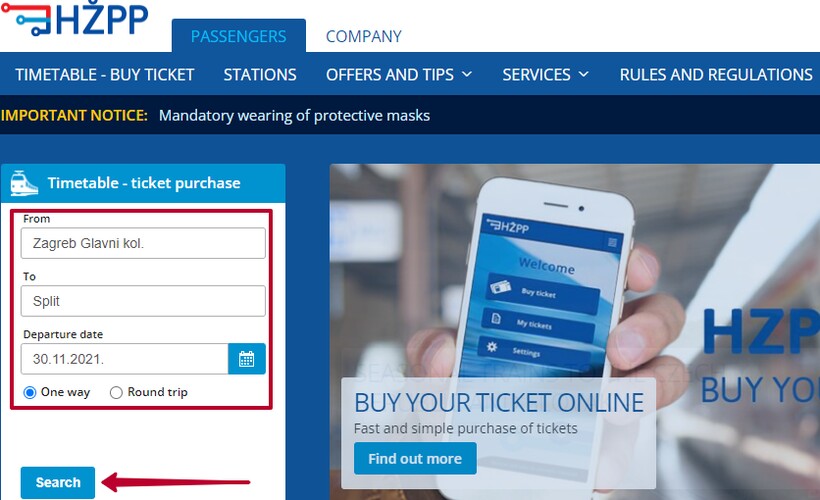 Приобрести билеты на поезда можно также на сайте Хорватских железных дорог и на ж/д вокзалах — в кассах или специальных автоматах (установлены только на крупных станциях).