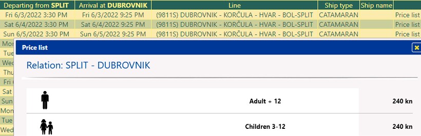 В летнее время у туристов пользуется популярностью сообщение по маршруту Риека — Сплит — Хвар — Корчула — Млет — Дубровник. Путешествие на пароме комфортнее, чем на автотранспорте, но и цены на билеты выше: например, переправа из Сплита в Дубровник стоит от 240 HRK (2700 ₽).