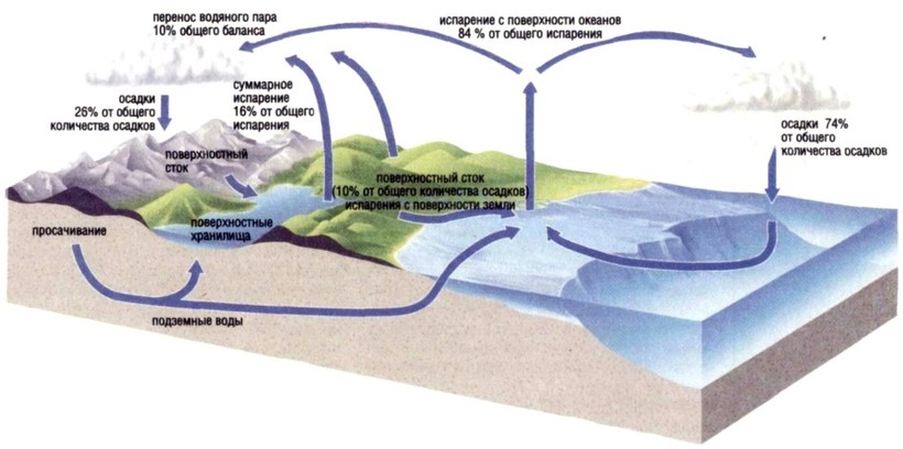 Круговорот воды объединяет оболочки Земли - атмосферу, биосферу, литосферу и гидросферу, так как вода входит в каждую из них.