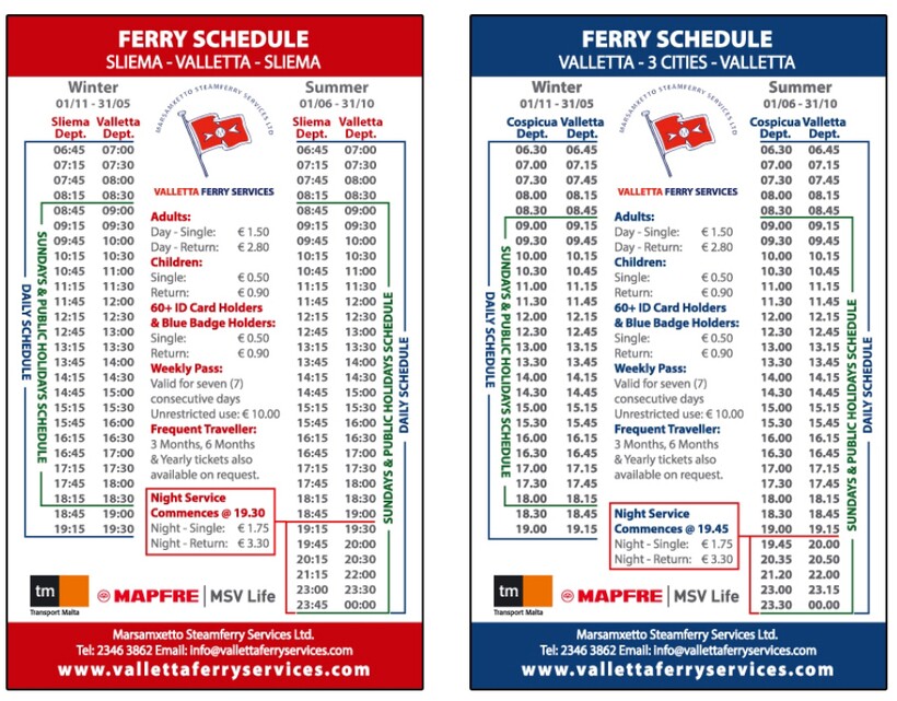 Паромы из Слимы отправляются по расписанию каждые 30 мин с 06:45 до 23:45 летом (с начала июня до конца октября) и с 06:45 до 19:15 зимой (с начала ноября до конца мая). Время в пути — 10 мин.