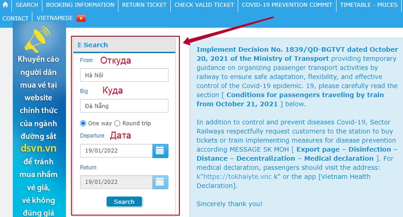 Узнать расписание поездов и приобрести билеты можно на железнодорожных вокзалах или на сайте «Вьетнамской железнодорожной корпорации». Выберите станцию отправления и прибытия, дату путешествия, и система поиска предложит вам оптимальные варианты преодоления маршрута.