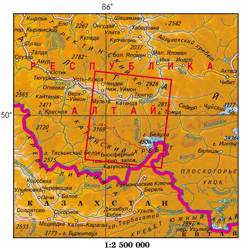 Что касается диапазона 40 и 50° с.ш. и 70 и 100° в.д., то там я нахожу Алтай и Тянь-Шань.