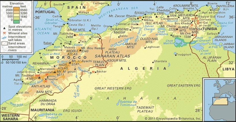 Внутри этого диапазона координат (30 и 40° с. ш. и меридианами 10° з. д. и 10° в. д. ) расположены и Пиренеи, и Атласские горы.
