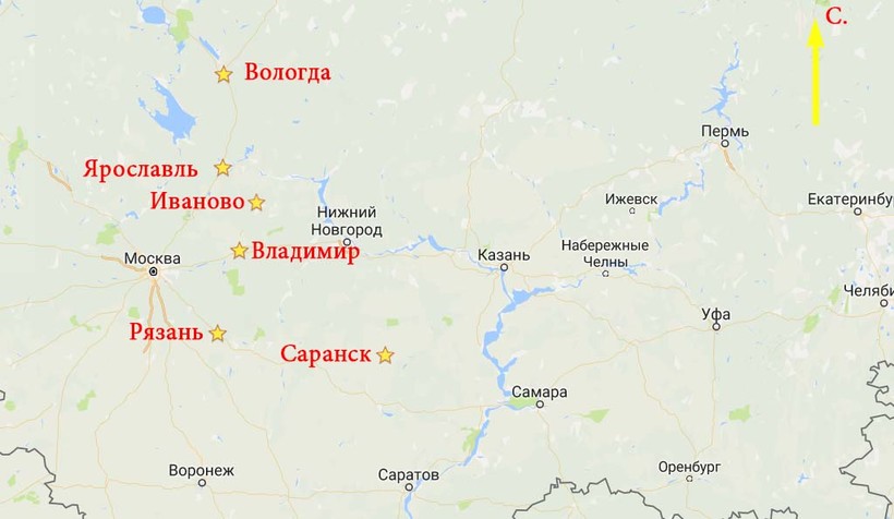 Проставьте в кружках номера городов от самого северного к самому южному. 1. Владимир 2. Вологда 3. Иваново 4. Рязань 5. Саранск 6. Ярославль
