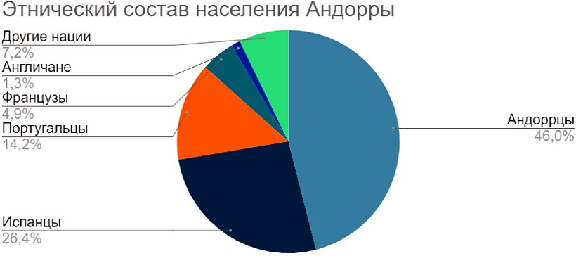 Коренными жителями Андорры являются потомки каталонских крестьян, которые первыми заселили Пиренеи. Этнические андоррцы составляют около 46 % населения княжества (34989 человек). Из представителей других национальностей в стране проживают: