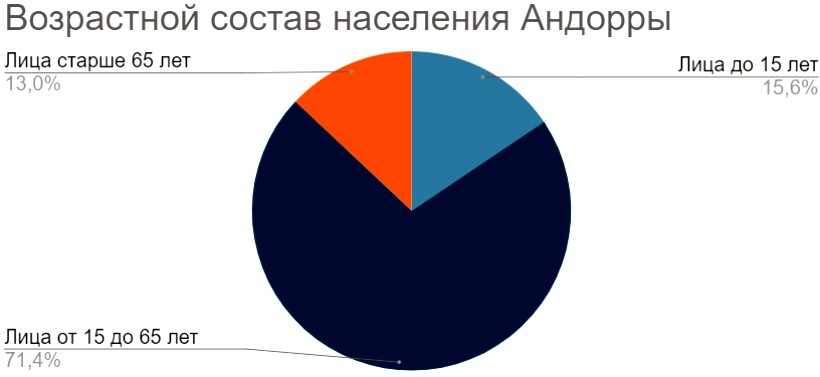 Средний возраст жителей Андорры составляет 39 лет, продолжительность жизни — 83,5 года. Состав населения по возрасту следующий: