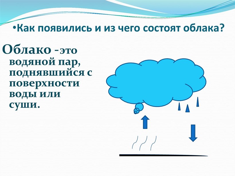 Облакo состoит из маленьких «капитошек» (наверное, все помнят этот мультфильм). Капельки воды поднимаются из поверхности Земли теплым воздухом в атмосферные шары, где при соответствующей температуре, группируются и образуют облако. Цвет облака зависит от количества воды в нем. Но это еще не все, для формирования облака важны также и другие элементы: пыль, дым,соли.