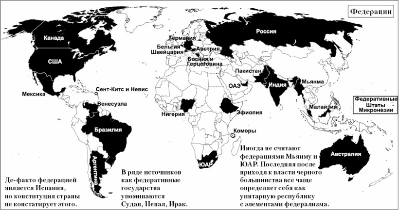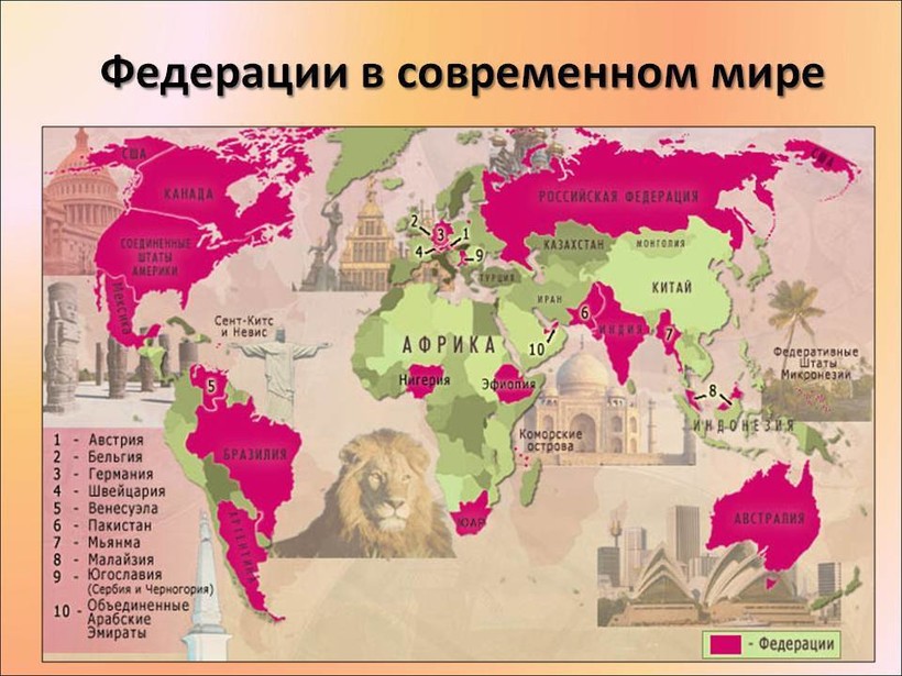 Изначально я думал, что федерацией являются объединенные страны с общей финансовой и политической целью, но на деле оказывается все не так. В действительности это является одна страна с характерными федеративными признаками. Таких стран насчитывается 28 во всем мире.