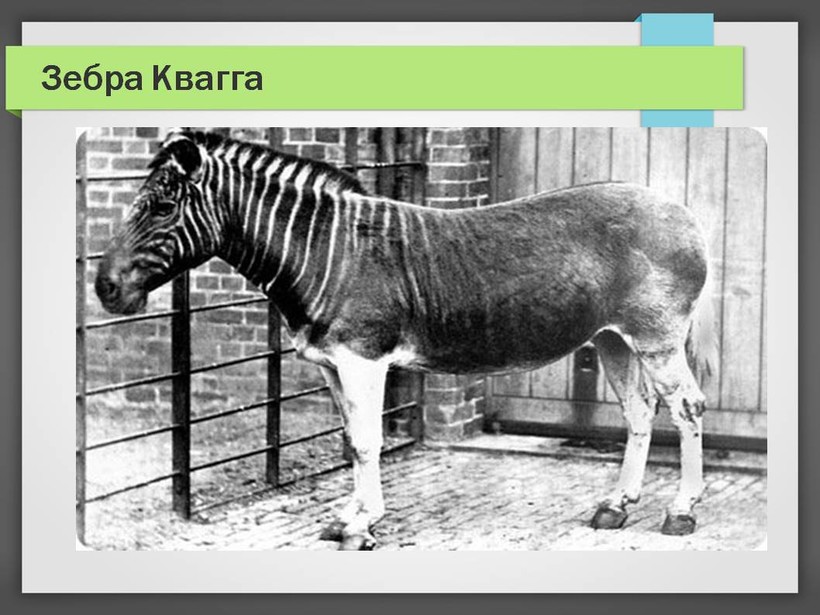 - зебра квагга — полностью уничтожена к концу девятнадцатого века, «благодаря» своей шкуре;