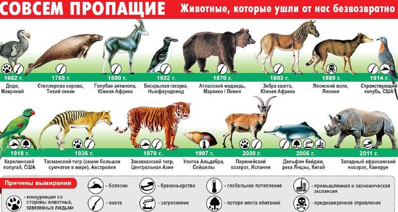 Чаще всего главным врагом растений и животных является человек. Он если и не истребляет их напрямую, то лишает возможности существования, меняя и уничтожая привычную среду обитания. Вот лишь несколько видов, которые уже не вернуть: