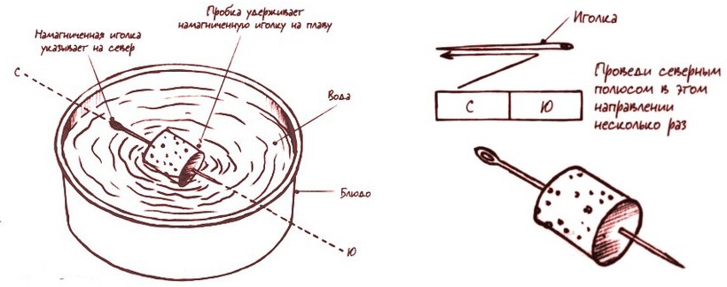 В качестве поплавка, можно использовать любой плавучий материал, ну а емкость под воду можно вырезать из пластиковой бутылки. Вот и все, как видно, изготовить простой компас совсем несложно.