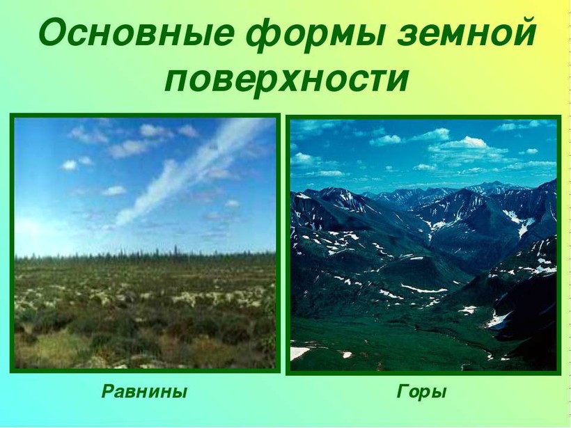 Поверхность нашей планеты неоднородна, причин этому очень много. Одной из главных можно назвать движение тектонических плит. В целом поверхность я бы поделил на водную и сухопутную. А вот вторая в свою очередь имеет такие формы: