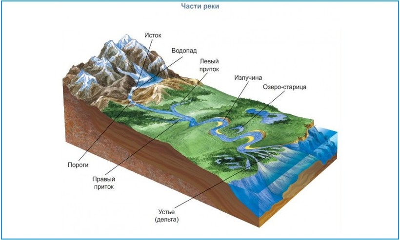 Исходным пунктом реки называется исток. Он может быть представлен болотом, озером, ледником или родником. У каждой реки есть долина – углубление с изгибами, которое идет от начала до устья реки. Ту часть, где река впадает в море, реку или озеро, называют устьем. Самая глубокая и полноводная часть речной долины имеет название русло. Честь долины, что периодически затапливает водой, называют поймой. Выше от пойм всегда будут участки, которые больше не заливает водой, так называемые террасы, что раньше служили для реки поймами. Каждая река имеет один и более приток.
