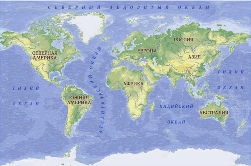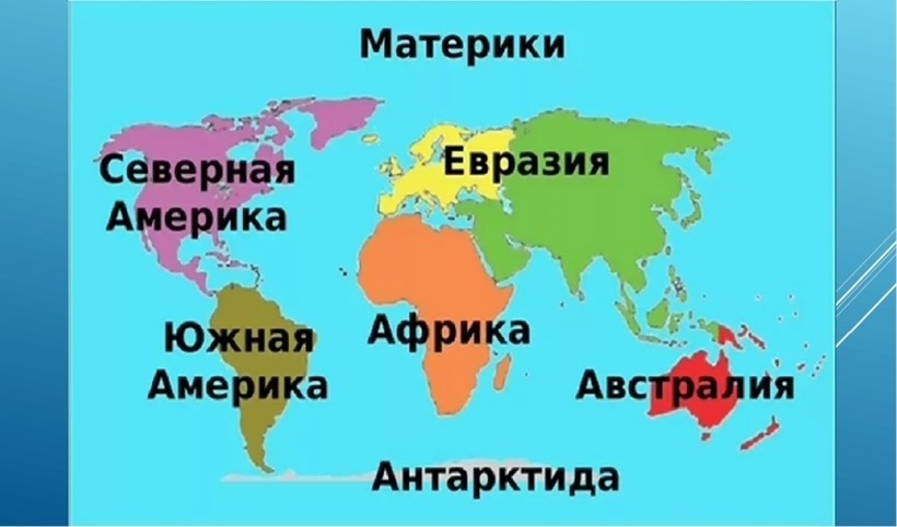 - Евразия. Мы с вами живем на этом северном материке. Он по праву считается самым большим. Его омывают все 4 океана!