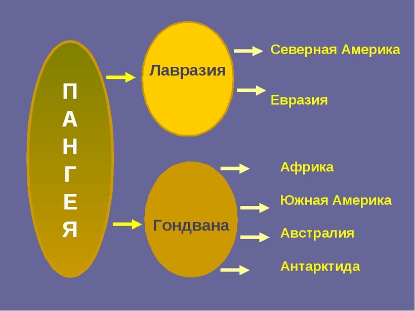Много миллионов лет на планете был один материк — Пангея, разделившаяся потом на несколько частей. Сначала их было 2: Гондвана и Лавразия, а уже позже произошло дробление этих огромных материков на более мелкие.