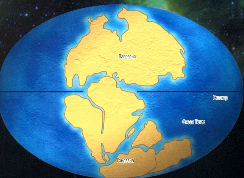 Во времена существования Гондваны и Лавразии древний океан, что разделял их, назывался Тетис. Он был очень большой и включал южную половину Европы, север Африки, районы нынешних Средиземного, Черного и Каспийского морей, территории Памира, Тянь-Шаня, Гималаев, Индии и Тихого океана.