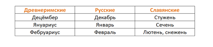 В первом столбце прочитай вслух названия зимних месяцев в древнем римском календаре. Сравни их звучание со звучанием