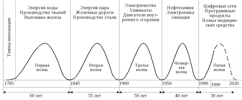 - 5-й цикл: наше «сегодня» — экспансия электроники, робототехники и телекоммуникаций;
