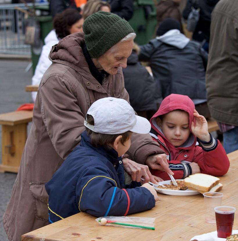 Для удобства посетителей ярмарки оборудованы специальные столы – мест хватает на всех.