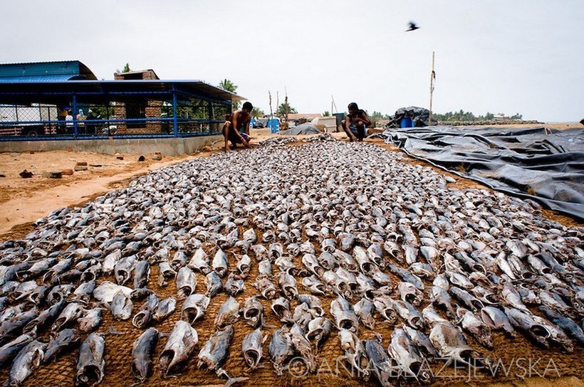Ближе к полудню рынок заметно пустеет и , чтобы рыба не портилась, продавцы выкладывают ее на огромные подстилки и сушат прямо под солнцем.