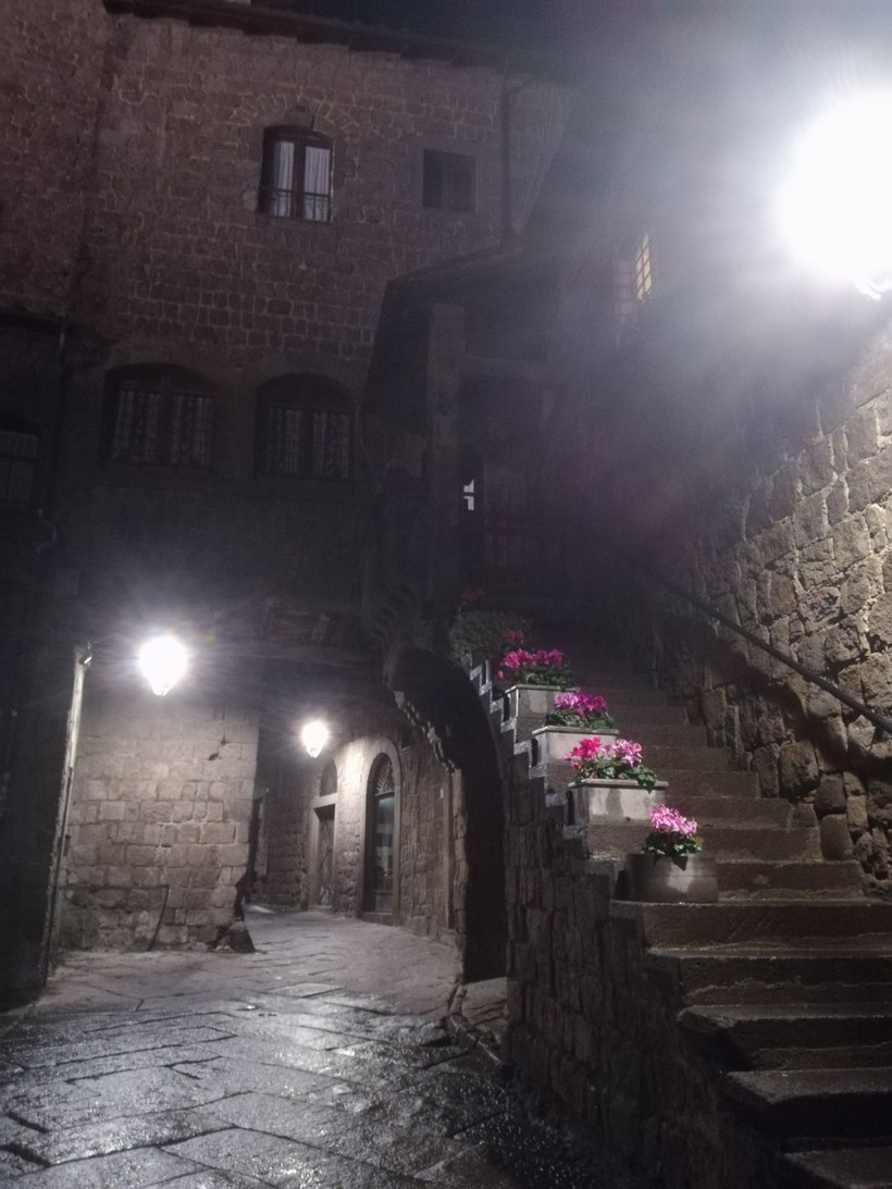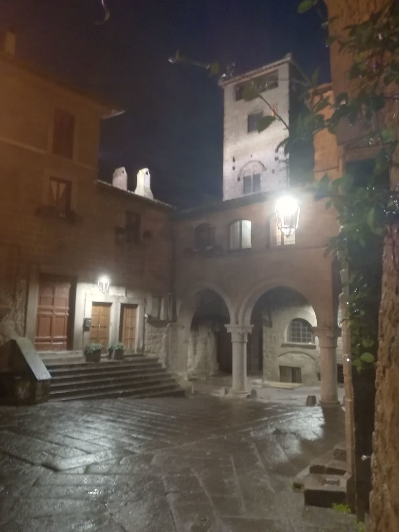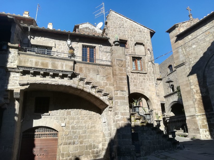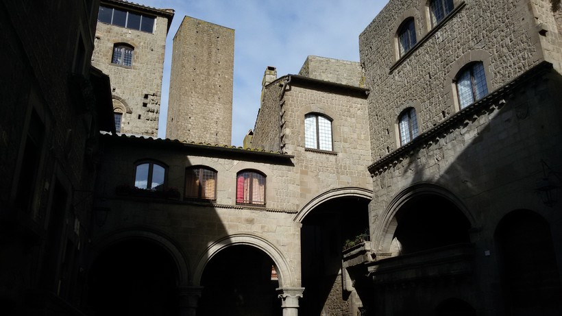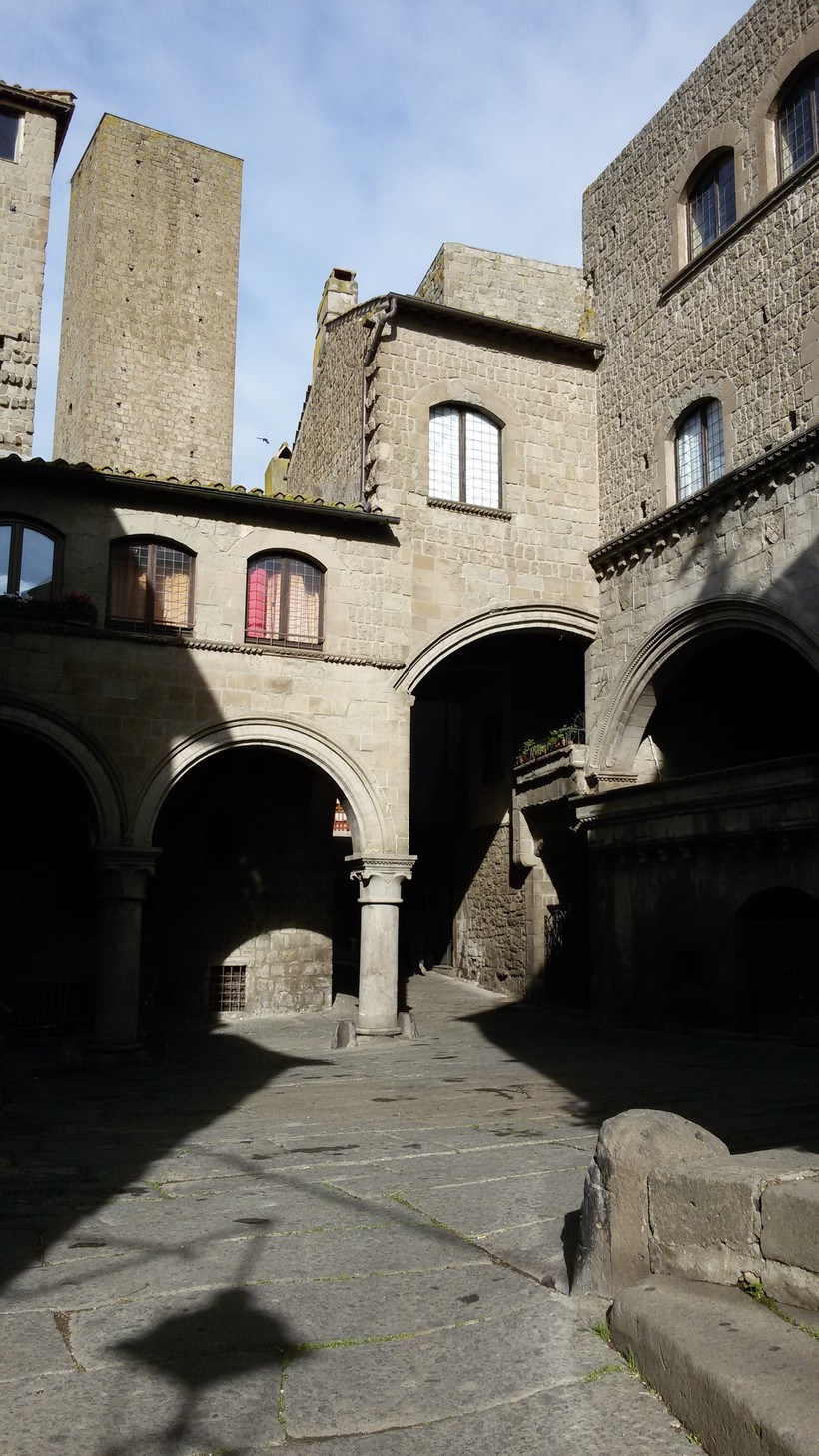 И словно попали в другой мир: необычные средневековые здания из серого камня, башни, узкие улочки, на которых почти не было людей. К тому же в тот день было холодно и пасмурно. И такой пустынный серый город, да еще без солнца, как нельзя лучше создавал атмосферу Средневековья. (Когда приезжали в Витербо во второй раз – в ноябре прошлого года, все было уже по-другому. Это были праздничные дни, на улицах старого города много туристов, проезжали машины, с трудом вписываясь в узкие улочки, и день стоял солнечный - уже не было такого «погружения».)