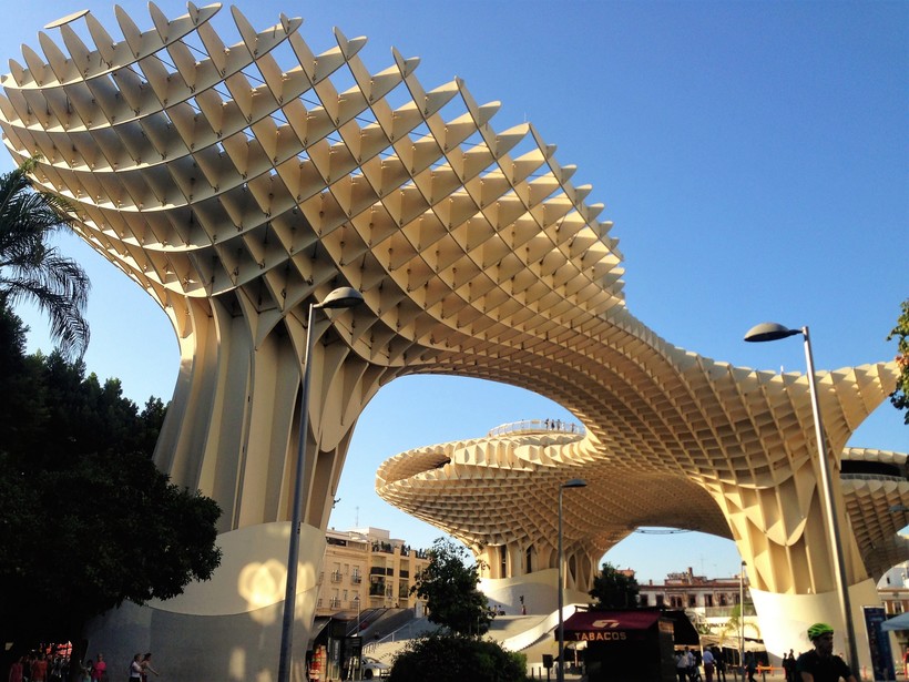 Так и появился комплекс Метрополь Парасоль, выполненный из деревянных элементов, скрепленных стальными прутьями и специальным клеем, который выдерживает лучи палящего солнца.