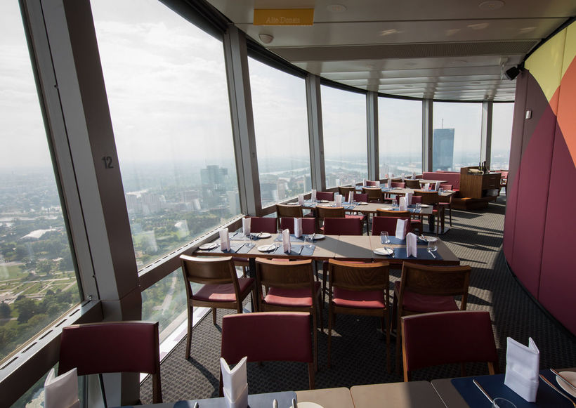 - Слопать штрудель на высоте 160 м. Конечно, на любой уважающей себя телебашне всегда открыт на радость посетителям вращающийся ресторан и кафе. Пусть Дунайская башня по телевизионным целям не используется (это, скорее, передатчик радиоволн и сотовой связи), здесь это в наличии тоже имеется. Да, это попса, но я до этого ни одну подобную башню ещё не посещала, поэтому устоять от чашечки ароматного меланжа с кусочком торта не могла. Кстати, цены здесь, по венским меркам, вполне нормальные, около 4 евро за чашку кофе, особых надбавок за прекрасный вид я не заметила.