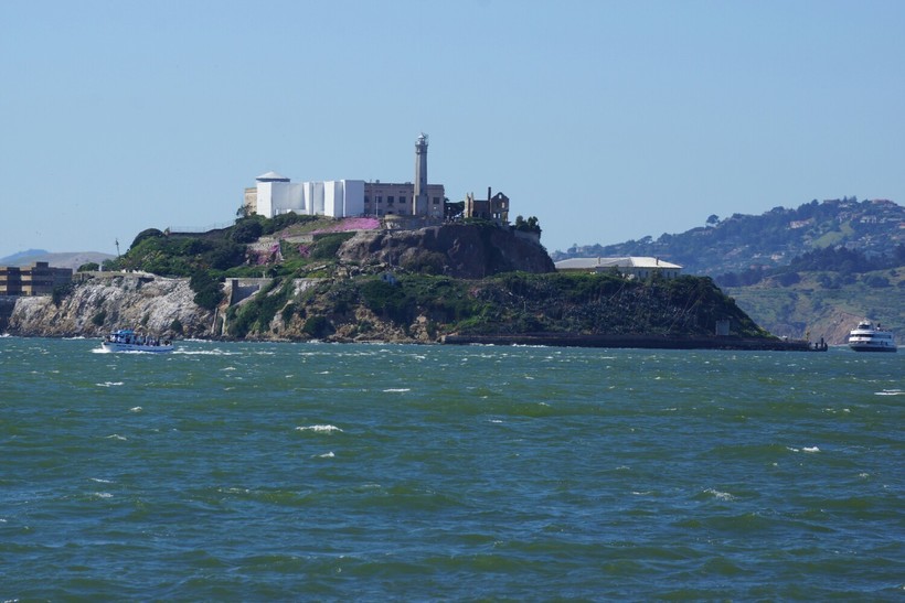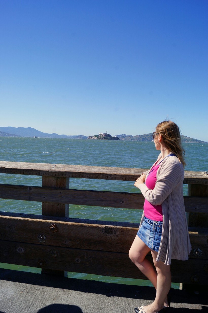 Еще с пирса видно знаменитую тюрьму Алькатрас, но она такая мелкая издалека, что вообще не понятно на фоне чего ты фотографируешься. Так что если хотите увидеть ее поближе, советую ехать туда отдельно. Далее фото для демонстрации. Первое как есть, а второе на максимальном приближение! Я не обратила внимание, но там точно должны быть телескопы!