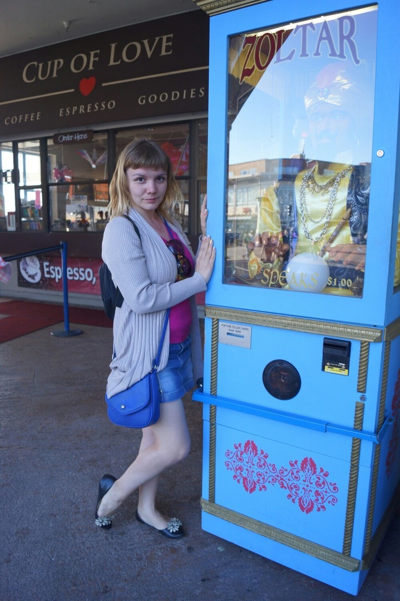 Гуляя по пирсу мы нашли автомат Золтар, ну тот самый из фильма! Получить желание стоит 1 доллар, везде говорят что это самая пустая трата доллара. Но это не так! Уж лучше потратить 1 доллар за то маленькое шоу, которое устраивает автомат, чем 5 долларов за магнитик.